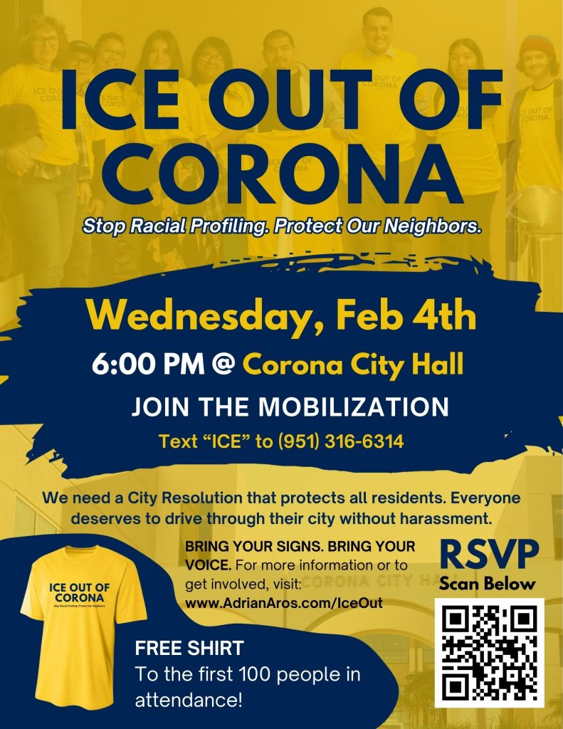 The first 100 people in attendance will receive a free “ICE OUT OF CORONA” shirt. Arrive early to secure yours and help us create a unified visual front for the media.